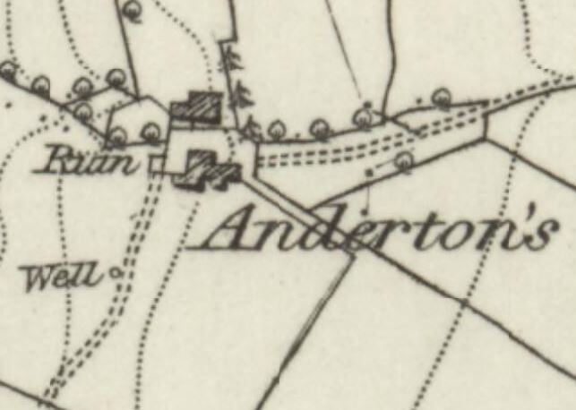 Old maps show Anderton’s clearly. On the 1849 Ordnance Survey, the farm appears centre‑right, with the later border of Yarrow Reservoir added for comparison. Ruinous structures surround the intact farmstead, suggesting earlier buildings or outbuildings.