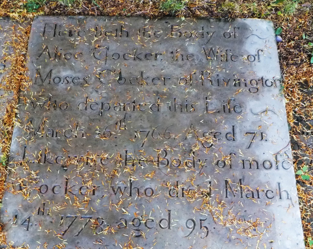 “Here lieth the Body of Alice Cocker, the Wife of Moses Cocker of Rivington, Who departed this life March 16th, 1766, Aged 71. Likewise the Body of mofes Cocker, who died March 14th 1778, aged 95.”