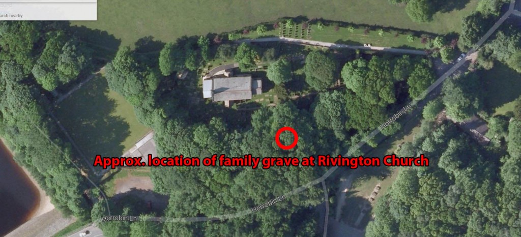 The figures to the far right are as yet undetermined. If the image was 1892, this would make Hannah 46 years old. Her husband Henry would have been 52. Martha would be 13, and Kate would be 2. Hannah giving birth to Kate at the age of 44 may seem unusual, but these dates are backed up by the gravestone which can be found in Rivington Parish Church: