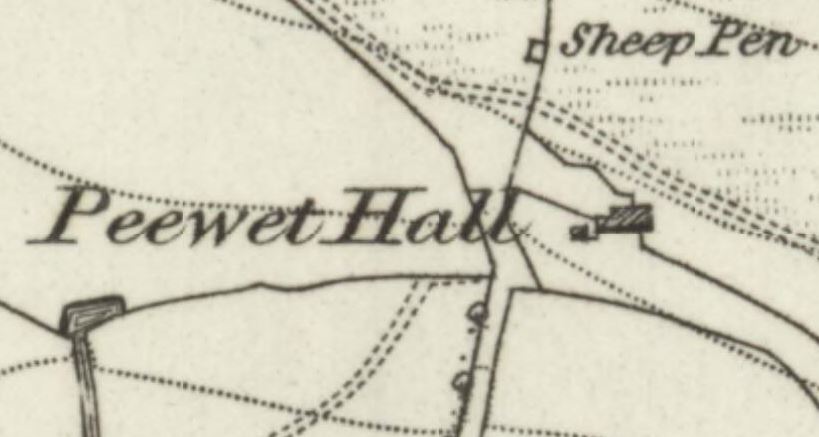 The outline of the ruins is clear to see. A sketch by D. A. Owen depicts Peewet Hall, and a lo‑res photograph of uncertain date survives.