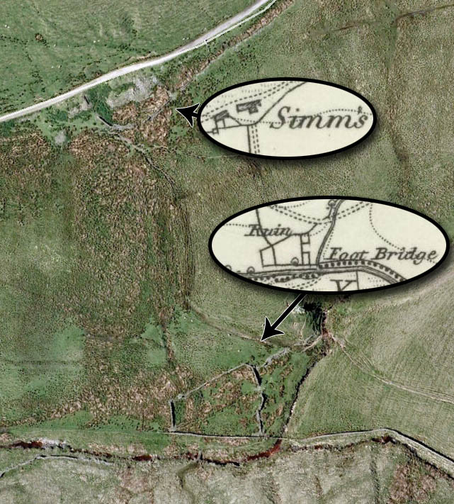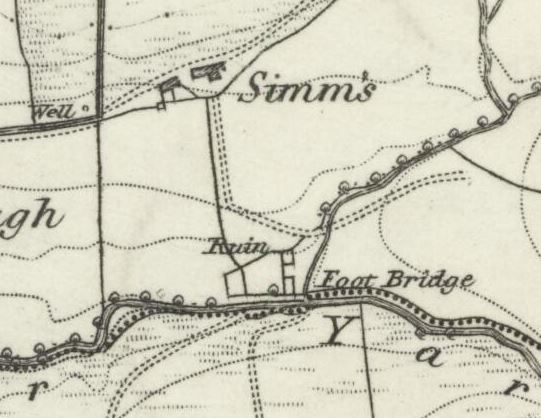 Maps show both the later location of Simms and the unmarked ruin near the river bank. “Perhaps the older ruin is in better condition due to it disappearing from mapping?”